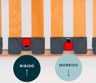 Rete ergonomica con telaio in multistrato di faggio resinato, sospensioni ammortizzate con tasto di regolazione della portanza che permette la massima personalizzazione su tutta la superficie di contatto. Cursori di rigidità nella zona bacino e doghe in multistrato di faggio resinato a 7 strati che garantiscono al supporto un’elevata flessibilità e una lunga durata.