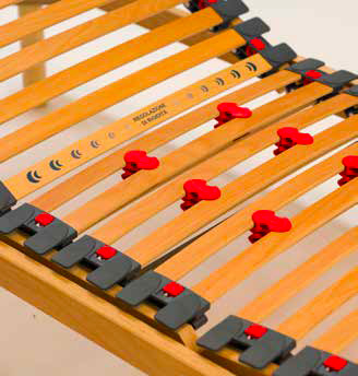 Rete ergonomica con telaio in multistrato di faggio resinato, sospensioni ammortizzate con tasto di regolazione della portanza nella zona spalle e sospensioni anatomiche in SEBS. Cursori di rigidità nella zona bacino e doghe in multistrato di faggio resinato a 7 strati che garantiscono al supporto un’elevata flessibilità e una lunga durata.